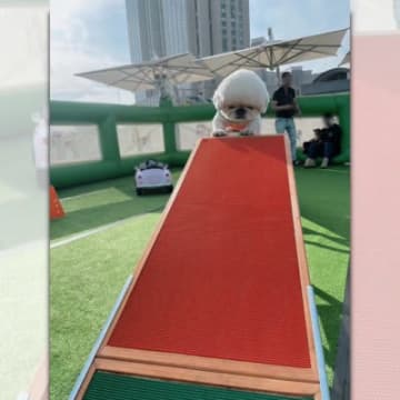 降りられない!遊具の傾斜に戸惑うペキニーズさんの困り顔が可愛い♡