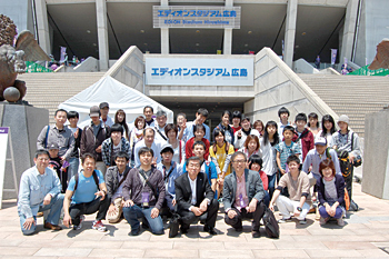 会場のエディオンスタジアム広島までは約2時間のバスの旅。会場到着後は全員で記念撮影を行い、試合開始まで1時間ほどは、グッズ購入やスタジアム周辺の散策など、各自が自由時間を楽しんだ。試合開始1時間前には応援席について、みんなでサンフレッチェ広島公認の「王者の幕の内弁当」を広げながら応援の準備を整えた。