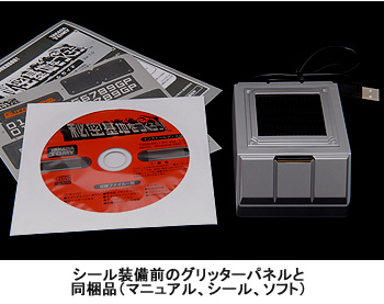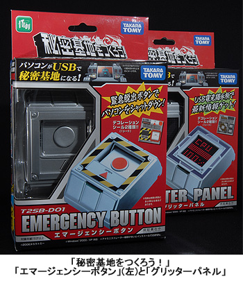 「エマージェンシーボタン」「グリッターパネル」いずれの製品も、ハードウェア1台に加え、専用ソフトウェアを収録したCD-ROMと操作マニュアルを同梱する。さらに、シルバーメタリック塗装の本体を秘密基地仕様にグレードアップさせる特殊シールが付属している。それぞれの装備に2パターンのシールが同梱されているため、基地の仕様や装備の色合いに合わせ、より適合するデザインを選択することができる。
