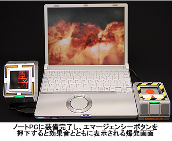 なお、「エマージェンシーボタン」押下時におけるPC本体の挙動に関しては、初期状態では、映像で警告画面や爆発画面などが表示された後、シャットダウンするよう設定されている。ボタン押下時の挙動については、秘密基地の規定などに応じて、「アプリケーションの起動」や「マクロの起動」などに割り当てることも可能。汎用的なボタンとしても活用できるよう設計されている。