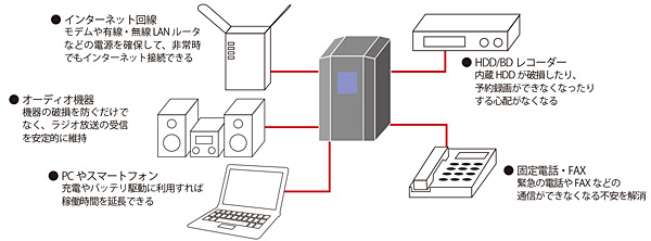 大地震などの災害発生時には、UPSにつないだすべてのデジタル機器の電源を安全に一度オフにしてから、通信や情報収集のためにモデムに電源を入れるとか、携帯電話を充電するといった使い方もできる。