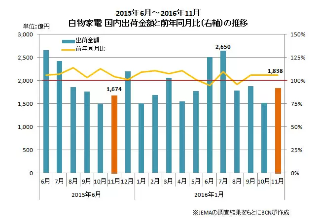 JEMA、白物家電の2016年11月の国内出荷金額を発表、3か月連続でプラス