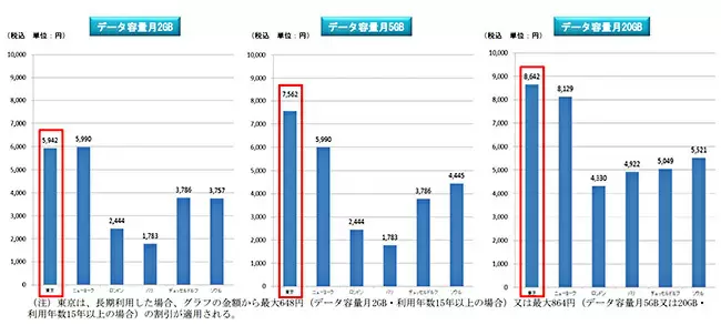 一方、データ容量の少ない月2GBと月5GBでは、東京はそれぞれ2680円、3760円となり、ニューヨーク、ソウルに次ぐ3位の中位グループとなる。