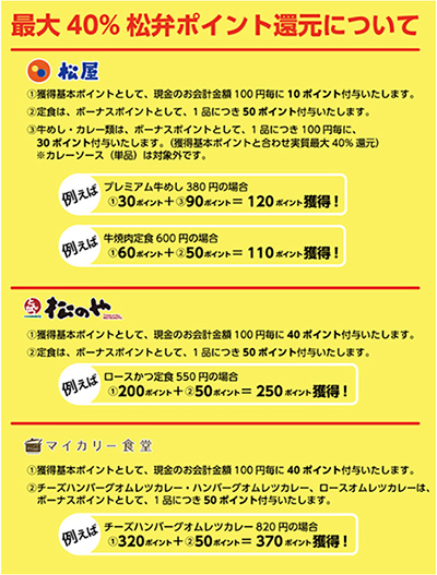 期間中に受取予約で注文すると、通常は100円ごとに1ポイント付与(1%還元)のところ、松屋では「牛めし・カレー類」カテゴリーの注文の場合、100円ごとに40ポイントが加算される。松のや、松乃家、マイカリー食堂では全商品で100円ごとに40ポイントを加算する。