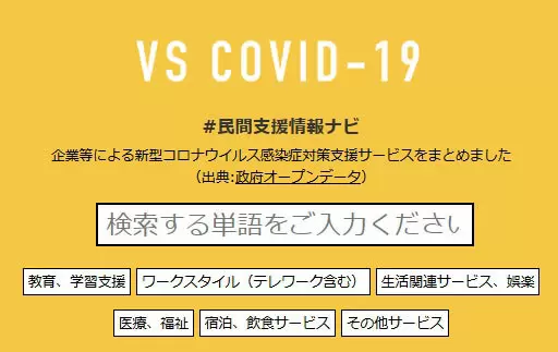 政府は、3月9日に「#民間支援情報ナビ」プロジェクトを始めた。民間企業が新型コロナウイルス感染症対策として無償、安価で提供する在宅ワークやオンライン学習などを支援するサービスの情報を一元化したもの。内閣官房、総務省、経済産業省が産業界の各団体に情報提供を依頼。提供される無償などの支援情報のデータ・フォーマットを標準化し、公開する。Civic Tech団体と連携して提供する。