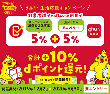 d払いが12月2日から実施していた「d払い生活応援キャンペーン」も30日でいよいよ終了となる。こちらは対象店舗でキャッシュレス消費者還元事業の5%にさらに5%を上乗せ、合計10%を還元するというもの。