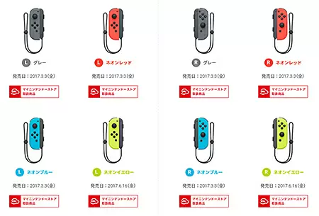 現行価格は税別4480円だが、11月6日から税別3740円で販売する。Joy-Con単品はマイニンテンドーストアで現在6色(ネオングリーンはL、ネオンピンクはRのみ)を展開中。10月27日には、新たにレッドをラインアップする。