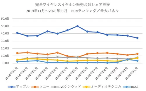 メーカーシェアでは、アップルが3割強を占めてトップをキープ。ただ、5月をピークに徐々に落ちており、競合各社の成長がうかがえる。2番手以降は、ソニー、JVCケンウッド、オーディオテクニカ、ボーズの順で並ぶ。いずれも、販売台数前年比ではアップルを上回っている。