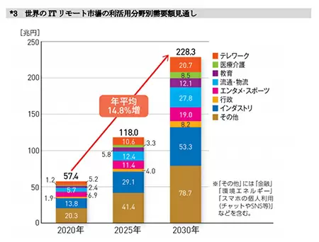 その中で、ITリモート市場の世界需要額は年平均14.8%で成長し、30年に228.3兆円となり、20年比で約4倍に拡大する見通しを示した。中核となるソフトウェアによるソリューションサービスは、30年に143兆円の規模になる見通し。