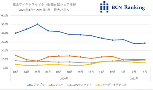 全国の家電量販店やECショップでPOSデータを集計する「BCNランキング」によると、2021年3月の完全ワイヤレスイヤホンの販売台数前年同月比は116.3%。前月は「BCNランキング」の集計開始以来、初めて前年を割った同カテゴリーだがすぐさま回復。市場の成長が衰えていないことを証明した。