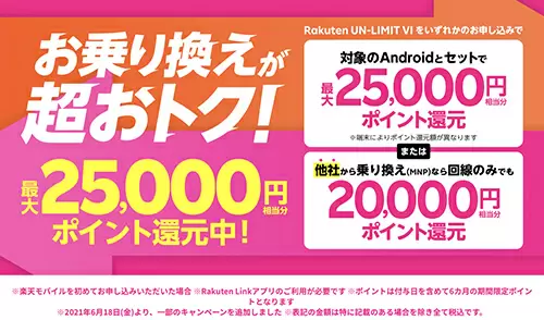 今年4月30日から新たにiPhoneの取り扱いを開始した楽天モバイルは、「Rakuten UN-LIMIT」に初めて申し込み、指定の条件を全て満たすと最大2万5000円分の楽天ポイントをプレゼントする「お乗り換えが超おトク!最大25,000円相当分をポイント還元!」キャンペーンを実施している。