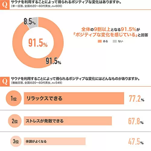 サウナを利用することによって、ポジティブな変化を感じている人は91.5%に達しており、具体的な変化としては(複数回答)、「リラックスできる」(77.2%)、「ストレスが発散できる」(67.8%)、「体調がよくなる」(47.5%)が上位を占めた。