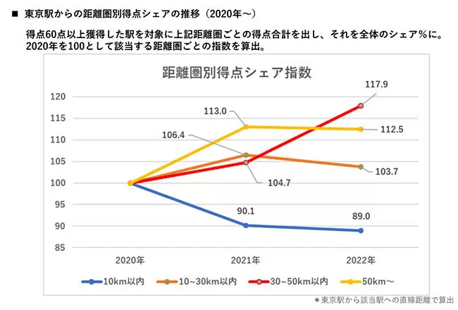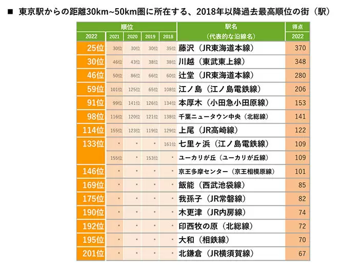 東京駅から30~50km圏では、「京王多摩センター」「飯能」「我孫子」「木更津」「印西牧の原」「大和」「北鎌倉」の7駅が初めてランキングにランクイン。順位は146~201位。全体でみると決して人気とは言い難いが、リモートワークの普及や住まい、通勤に対する意識の変化が反映された結果といえるだろう。