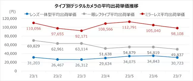 出荷金額を出荷台数で割った平均出荷単価をみるとレンズ一体型は3万723円で、一眼レフは4万9837円、ミラーレスは9万8108円だった。
