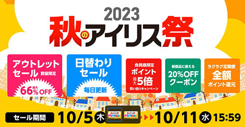 アイリスオーヤマは、2023年「秋のアイリス祭」を、公式通販サイト「アイリスプラザ」内で10月5日から11日15時59分まで開催している。
