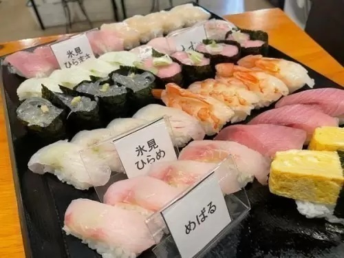 寿司食べ放題では、富山県氷見・茨城県久慈・北海道函館で水揚げされ、店舗に直送された新鮮鮮魚20種類程度を使用し(仕入れ漁港・魚種はその時によって変わる)、寿司以外にもお惣菜2~3種、揚げ物2~3種などを食べ放題で楽しめる。