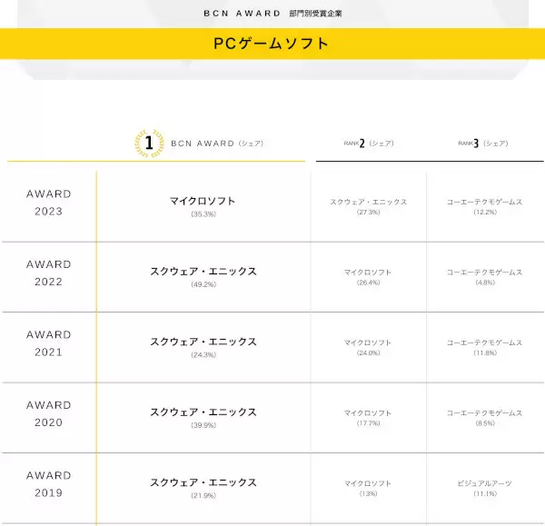 「BCN AWARD」は、家電量販店などから集計している実売データ(POSデータ)をもとに、部門(ジャンル)ごとに年間販売数量累計1位の企業を表彰する制度。前年の実績をもとに表彰するため、「BCN AWARD 2024」の対象期間は23年1月1日~12月31日となる。ソフトウェア部門は、「ビジネスソフト部門」と「PCゲームソフト」に分かれる。どちらも原則PC向けだが、PC版ソフトを購入すると、スマートフォン(スマホ)/タブレット端末向けのモバイルアプリを利用できるライセンス形態もある。