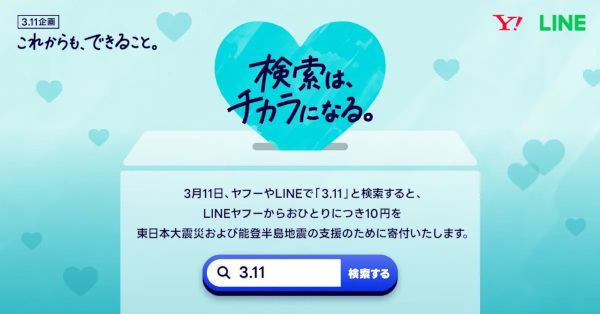 LINEヤフーは、「ヤフー」や「LINE」で「3.11」と検索すると1人につき10円をLINEヤフーから東北や能登の支援団体へ寄付する取り組み「検索は、チカラになる。」を3月11日23時59分まで実施している。