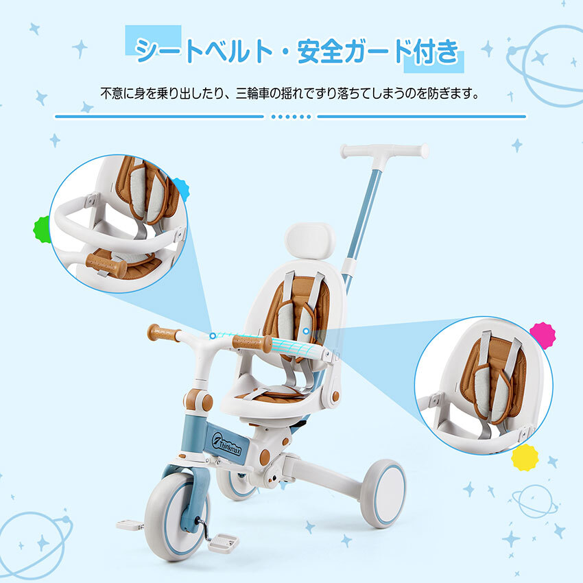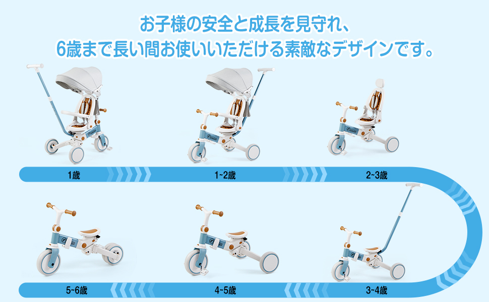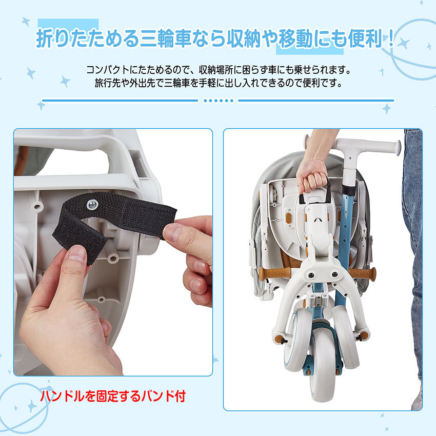 • 子どもの成長に合わせて6段階に形状を変える三輪車、折りたたみで便利