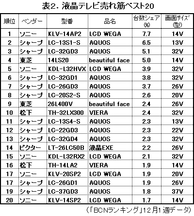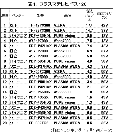 全国の大手家電量販店1491店舗のPOSデータを集計した「BCNランキング」によると、売り上げランキングの1位と2位をパナソニックのVIERAが獲得(表1)。