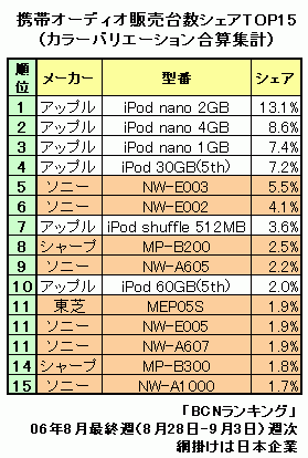 8月最終週(8月28日-9月3日)の、カラーバリエーションを合算した携帯オーディオ機種別ランキングトップ15を算出した。1位から4位までをアップルが占め、絶好調の「iPod nano」が1、2、3フィニッシュを決めた。5、6位にはAAC対応で話題を集めたソニーの「ウォークマンEシリーズ」。7位に再び「iPod shuffle 512MB」……。このところ見慣れた順位だが、よく見ると、以前なら登場していたはずのアップル以外の海外勢がめっきり影を潜めてしまっているのに気付く。撤退したRioが消えたのは当然としても、iRiverやクリエイティブメディアといった以前は常連だったメーカーまでもが上位に登場しなくなってきているのだ。