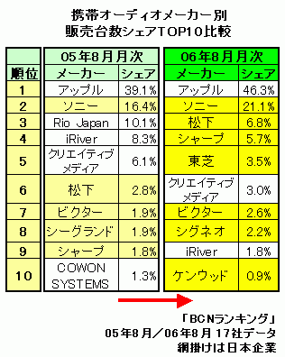 メーカー別販売台数シェアを1年前と比較してみると、この傾向ははっきりする。05年8月時点では、トップのアップルと3、4、5位のRio、iRiver、クリエイティブメディアが2位のソニーを挟み込むような形になっていた。しかし、今年の8月では、3、4、5位はいずれも日本企業が占めている。3位の松下は、SDカードを使う「D-snap Audio」シリーズが好調。この1年でシェアを倍増させた。またminiSDカード対応の「MP-B200/300」が好調のシャープも、1年前に比べ3倍以上の伸びを示している。また、gigabeat Pシリーズの「NANA」バージョンが人気の東芝もシェアをほぼ3倍に伸ばしてきた。一方iRiverはシェアを4分の1に減らしたほか、クリエイティブメディアも1年前の半分にシェアを落としている。