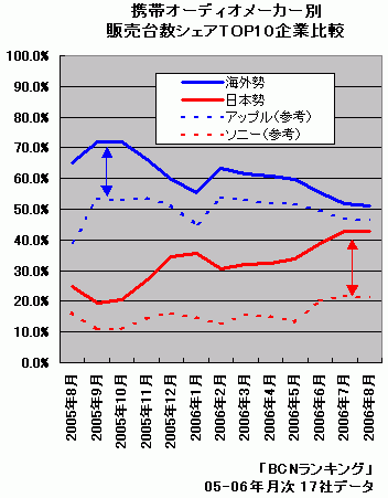 このグラフに、海外勢代表としてアップル、日本勢代表としてソニーのシェア推移を点線で重ね合わせると、その構造がよくわかる。05年8月ごろの段階では、海外勢全体のシェアと、アップル単独のシェアにはまだ開きがあった。つまりアップルに加え、それ以外の海外勢の力も強かったということだ。しかし徐々にその差は縮まり、海外勢はアップル1社に収斂する傾向になっている。逆に日本勢は、当初ソニーの占める割合が高かったが、徐々に日本勢全体とソニー単独のシェアは開く傾向にあり、ソニー以外にも健闘する日本企業が多くなってきたことがわかる。