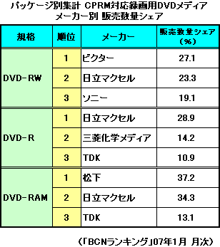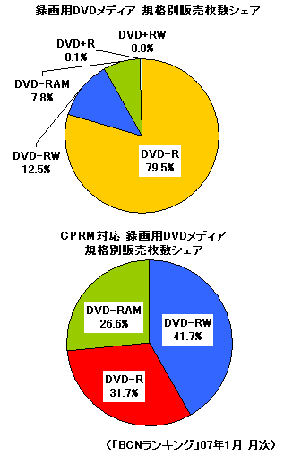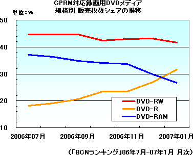 とはいえ、CPRM対応DVD-Rはここに来て急激に伸びており、06年1月の販売枚数を1とすると、07年1月は3.2倍に増加し、初めてDVD-RAMの販売枚数を上回った。CPRM対応メディアの中でのシェアも拡大している。このまま順調に販売数が増えれば、価格もこなれていくだろう。