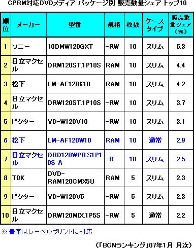 最後にパッケージごとに集計した、CPRM対応DVDメディアの売れ筋ランキングを見ておこう。1位はソニーのDVD-RWの10枚パック「10DMW120GXT」でシェアは5.3%。2位は、日立マクセルのDVD-RAMの10枚パック「DRM120ST.1P10S」でシェアは4.4%、3位もDVD-RAMの10枚パックで松下の「LM-AF120K10」だった。1位から7位までは10枚パック、8位から10位は5枚パックで、ほとんどがレーベル面にインクジェットプリンタで印刷できないスタンダードなタイプだった。