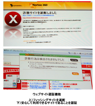 セキュリティ機能では、特にフィッシング対策機能を強化。ブラックリストを参照すると同時にヒューリスティック(特有の挙動パターンによって検知する)機能によってもフィッシングサイトを判別するため、未知のフィッシングサイトにも効力を発揮する。また、ユーザーが安心してウェブサイトを閲覧できるよう、本物のサイトかフィッシングサイトかを認証する「ウェブサイト認証機能」も搭載した。