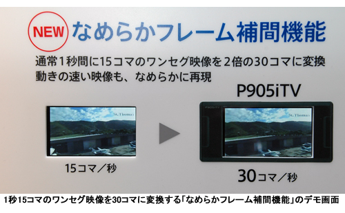 一方、「P905iTV」は、ディスプレイにワンセグ対応端末では業界最大の3.5インチワイドVGA液晶を採用。毎秒15コマのワンセグ映像を補完し、30コマにすることで、なめらかな表示を再現する「なめらかフレーム補間機能」、高感度の受信が可能なダイバーシティアンテナを搭載する。