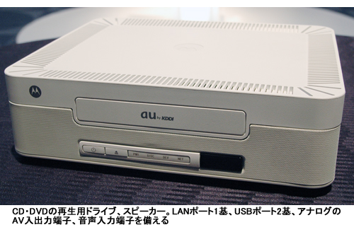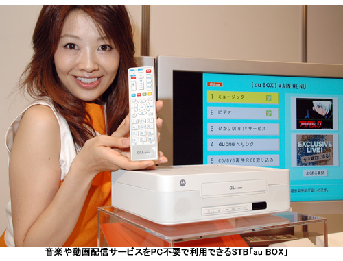 KDDIは9月25日、テレビや携帯電話を接続して音楽や動画を楽しむことができるSTB(セットトップボックス)「au BOX」を開発し、11月1日からレンタルを開始すると発表した。携帯電話ブランド「au」のユーザーを対象に提供する。レンタル料は月額315円。