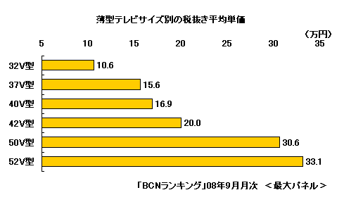 9月のBCNランキングで薄型テレビの平均単価をみると、40V型は税抜き約17万円、42V型は約20万円、50V型は約30万円、52V型は約33万円。ちなみに32V型は10万円強、37V型は15万円強。40-42Vは20万円前後が平均なので、大画面のなかでも手の届きやすい価格だ。
