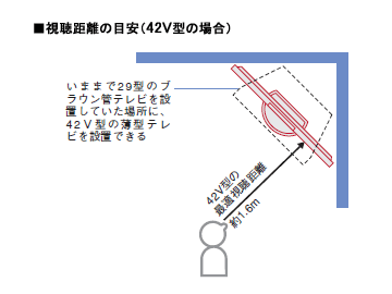 さて、実際に買う場合は、まず部屋のサイズに合うかどうか、確かめておきたい。薄型テレビの視聴距離は、パネルの縦幅の3倍が目安と言われている。42V型の場合、パネルの高さは約53センチなので、約1.6メートルの視聴距離が必要。そのほか、40-42V型の薄型テレビの外形寸法は、横幅が約1メートル、パネルの縁とテレビスタンドを含んだ高さが70センチ前後、奥行きが30-40センチくらい。現在、29型のブラウン管テレビを置いている場合は、同じスペースに42V型の薄型テレビを置くことが可能だ。