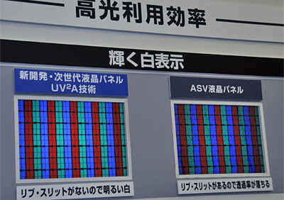 井淵良明副社長・デバイス事業担当は「シャープは、液晶テレビに対する省エネ性と高画質化への意識の高まりから、従来のASV技術に変わる次世代の技術が必要だと感じ、『UV2A技術』を30年前から、液晶分子の気持ちになって開発してきた。ナノテクを超えるピコスケールの技術であり、シャープだからこそ開発できた技術だ」と自信を見せた。