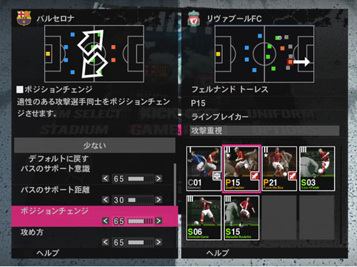 戦術設定には、2つの新システムを追加した。「スライダー」は、チーム全体の攻撃・守備スタイルを細部までコントロールできるシステム。サポートやポジションチェンジの意識、攻撃スタイルの変化やプレスの強弱、最終ラインの高さや相手との距離感などを、状況や戦況に応じて0-100の目盛りで詳細に設定できる。