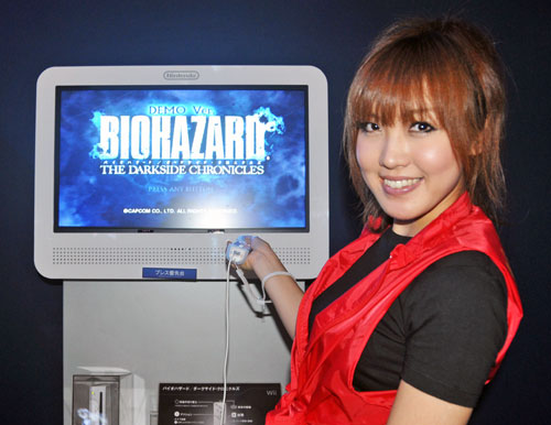 カプコンのホラーガンシューティングゲーム「バイオハザード」の新作「バイオハザード/ダークサイド・クロニクルズ」も注目の高いソフトの一つだ。発売は今冬の予定。07年に発売した「バイオハザード アンブレラ・クロニクルズ」の続編で、Wii用タイトルとしては2作目。「バイオハザード2」「バイオハザード コード:ベロニカ」のストーリーに加え、南米を舞台に展開するレオンとクラウザーの新ストーリーをプレイできる。筆者も45分ほど並んで、試遊してみた。