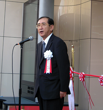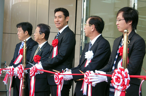 高嶋政伸さん(写真中央)や一宮忠男社長(右から2番目)、午前5時半から並んだ男性(右)などが、オープンを記念してテープカットした
