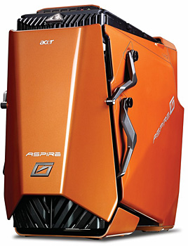 「プレデター」は、水冷システムと大型ファンによる二重の排熱機構を備えたゲーミングPC。フロントカバーが上部にスライドし、内部にドライブなどを飲み込んでいるようなデザインが特徴だ。新モデルでは、OSにWindows 7 Home Premium(64bit版)を採用した。