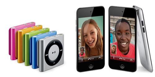 ボタンが復活したiPod shuffle(左)、カメラを搭載し、ビデオ通話も可能なiPod touch(右)
