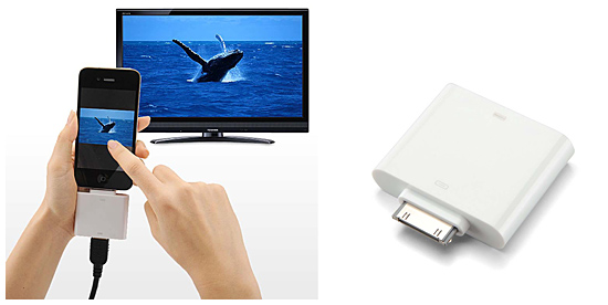 「500-HDMI003」を介して、HDMIケーブルでiPhone 4やiPadをテレビに接続できる。iPhoneやiPad内の写真や動画や動画共有サイト「YouTube」映像のほか、iPhone/iPadアプリ「Good Reader」「Keynote」を使用してPDFファイルなどの出力が可能。