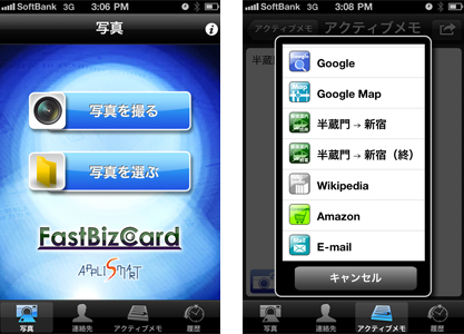 FastBizCardのスタート画面(左)、「アクティブメモ」機能