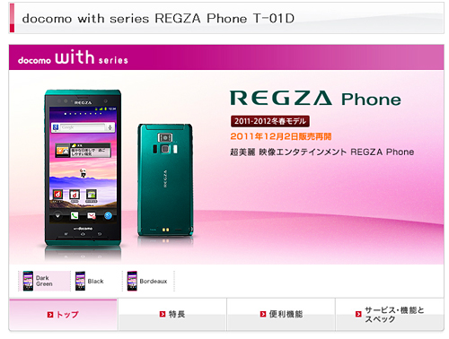 12月2日から販売を再開する「REGZA Phone T-01D」の紹介ページ
