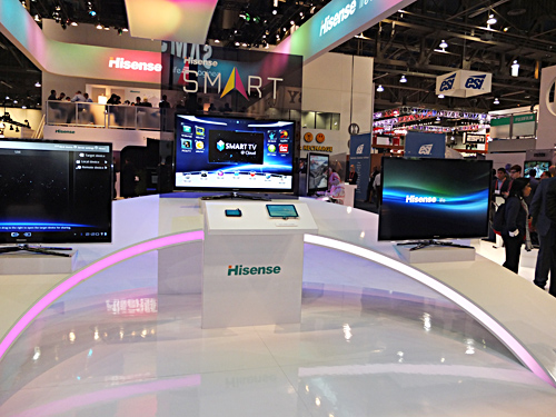 中国最大手のデジタル家電メーカー、ハイセンスのブースは、薄型テレビで埋め尽くされている。白物家電も扱う同社がテレビをアピールするのは、テレビで世界のメーカーに追いつこうとする意志の現れだ。しかも他社同様、スマートフォンやタブレット端末との連携も強調している。さらには、競合他社の危機感を煽るように、メガネなしで3D映像を楽しめる56型の3Dテレビも発表している。