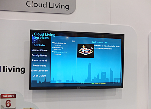 中国の白物家電大手メーカー、ハイアールは、テレビを前面的に押し出したブースに仕上げていた。同社は「クラウド・リビング」というテーマを掲げ、洗濯機やPC、そのほかの家庭内機器を制御するリモート機器の中心にテレビを据えている。また、ユーザーが脳波でテレビをコントロールする開発中の製品を展示していた。