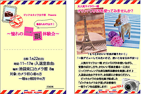 ビックカメラは、1月22日、女性向けのミラーレス一眼体験会「集まれカメラ女子! ~憧れの一眼体験会~」をビックカメラ池袋東口カメラ館で開催する。