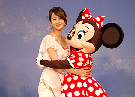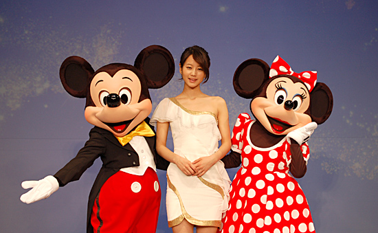 ミッキーとミニーに挟まれてうれしそうな堀北真希さん