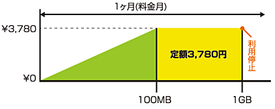 データ使用量が1か月以内に1GBに達すると料金月の末日まで利用停止になるが、上限値設定を変更すれば1GB以上でも利用できるようになる。1GB+100MBまでは3780円+使用した分(1MBあたり37.8円)。1.1GB~2GBまでは3780円+3780円で7560円となる。