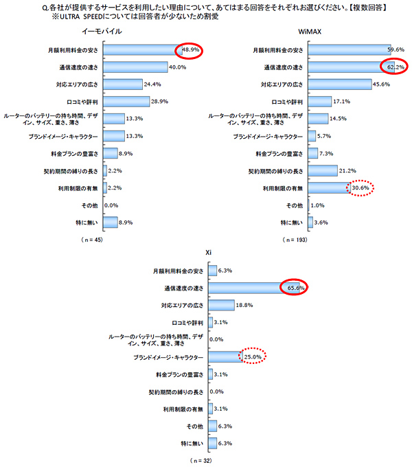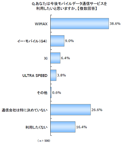 また、各モバイルデータ通信サービスの利用意向について聞いたところ、UQコミュニケーションズの「WiMAX」が38.6%でトップ。次にイー・アクセスの「EMOBILE G4」が9.0%、NTTドコモの「Xi(クロッシィ)」が6.4%となった。サービスごとに利用したい理由を聞くと、「WiMAX」と「Xi」は、「通信速度の速さ」がそれぞれ6割強で最も多かった。