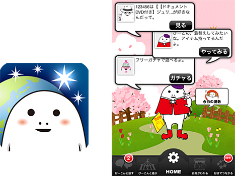 宇宙からやってきた謎のキャラクター「ぴーこん」と遊ぶソーシャルアプリ。「ぴーこんと話す」「ぴーこんと遊ぶ」「自分が分かる」「好きでつながる」など、ユーザーが自由に遊び方を選べる。